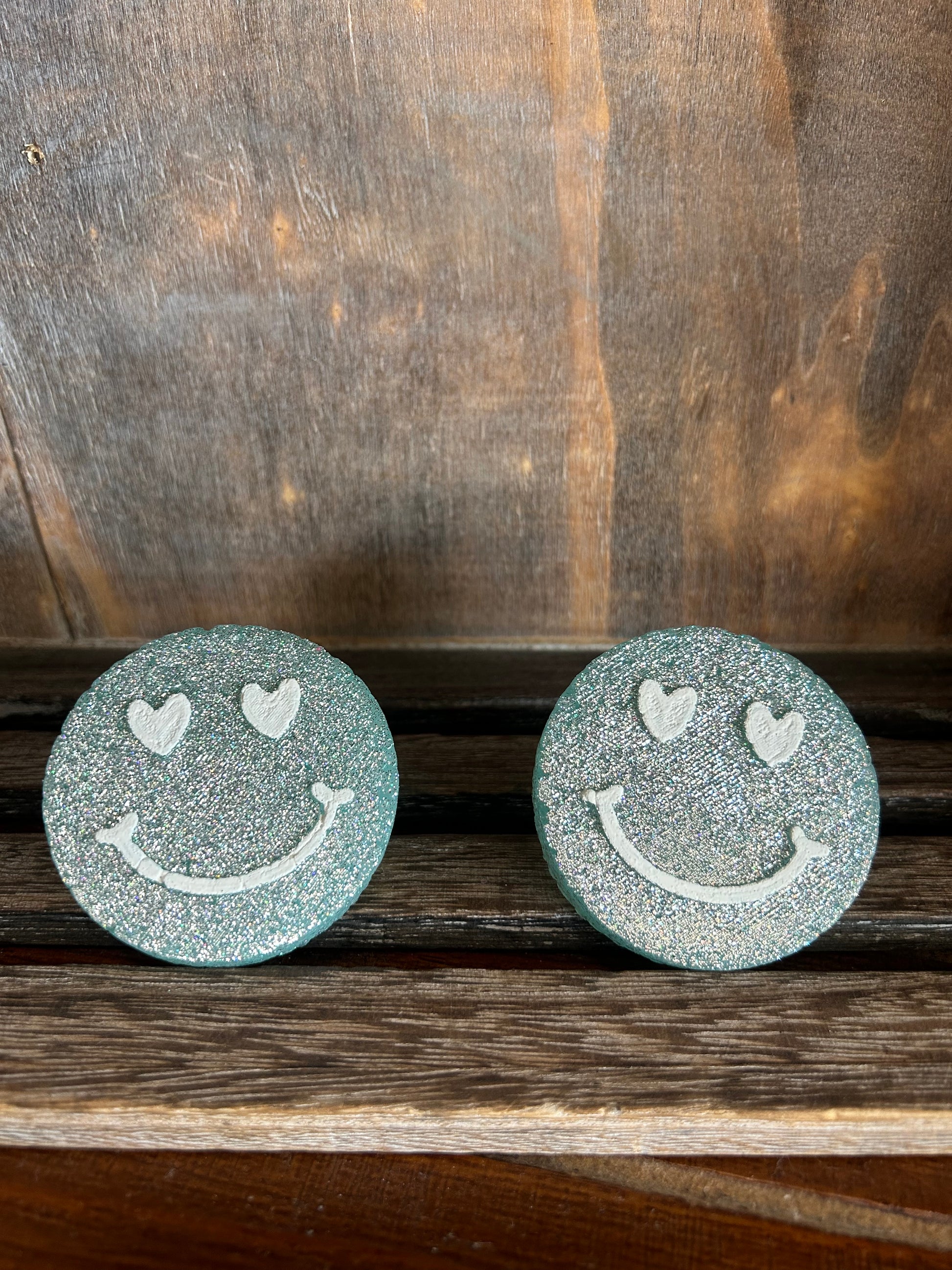 Add some sparkle and smiles to your ride with this set of two glittery vent clips, featuring a playful heart-eyes smiley face design! These silver-toned clips are bursting with cheerful vibes and make the perfect car accessory to keep things cute and smelling fresh!