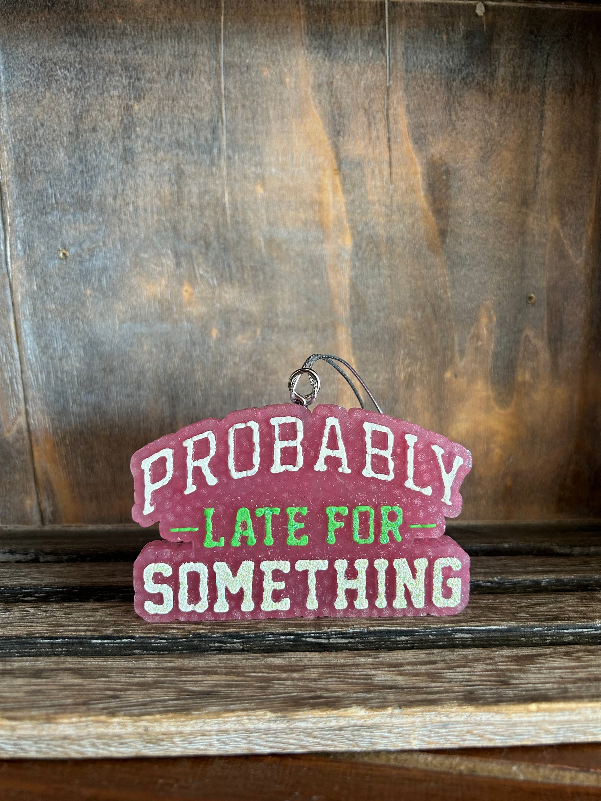 Always on the go? This cheeky “Probably Late for Something” freshie adds personality to your ride with its bold lettering and playful attitude. Hand-painted in a rich berry tone and lightly glittered, it keeps your car smelling amazing while showing off your busy-girl energy.